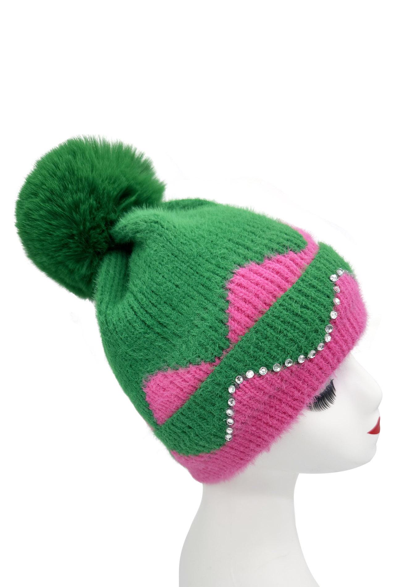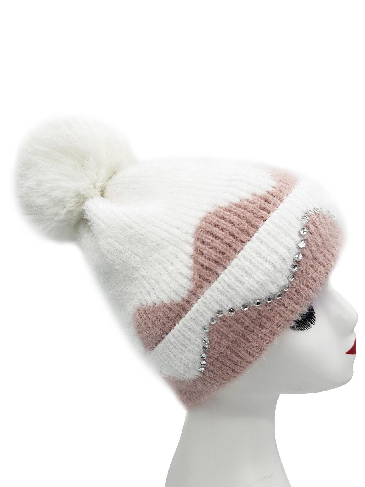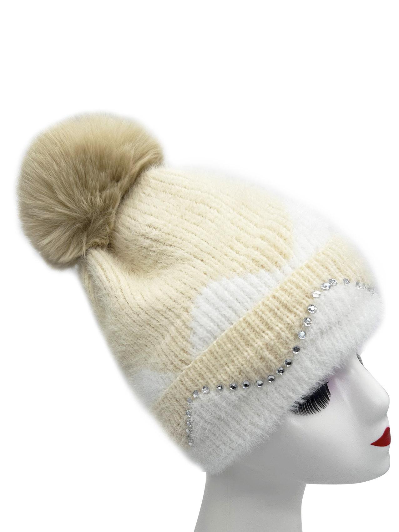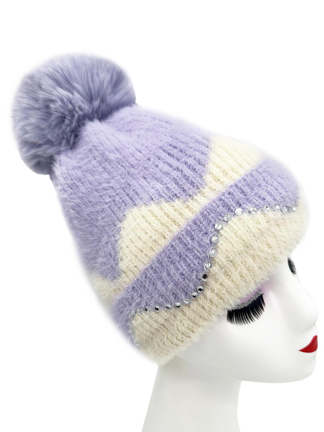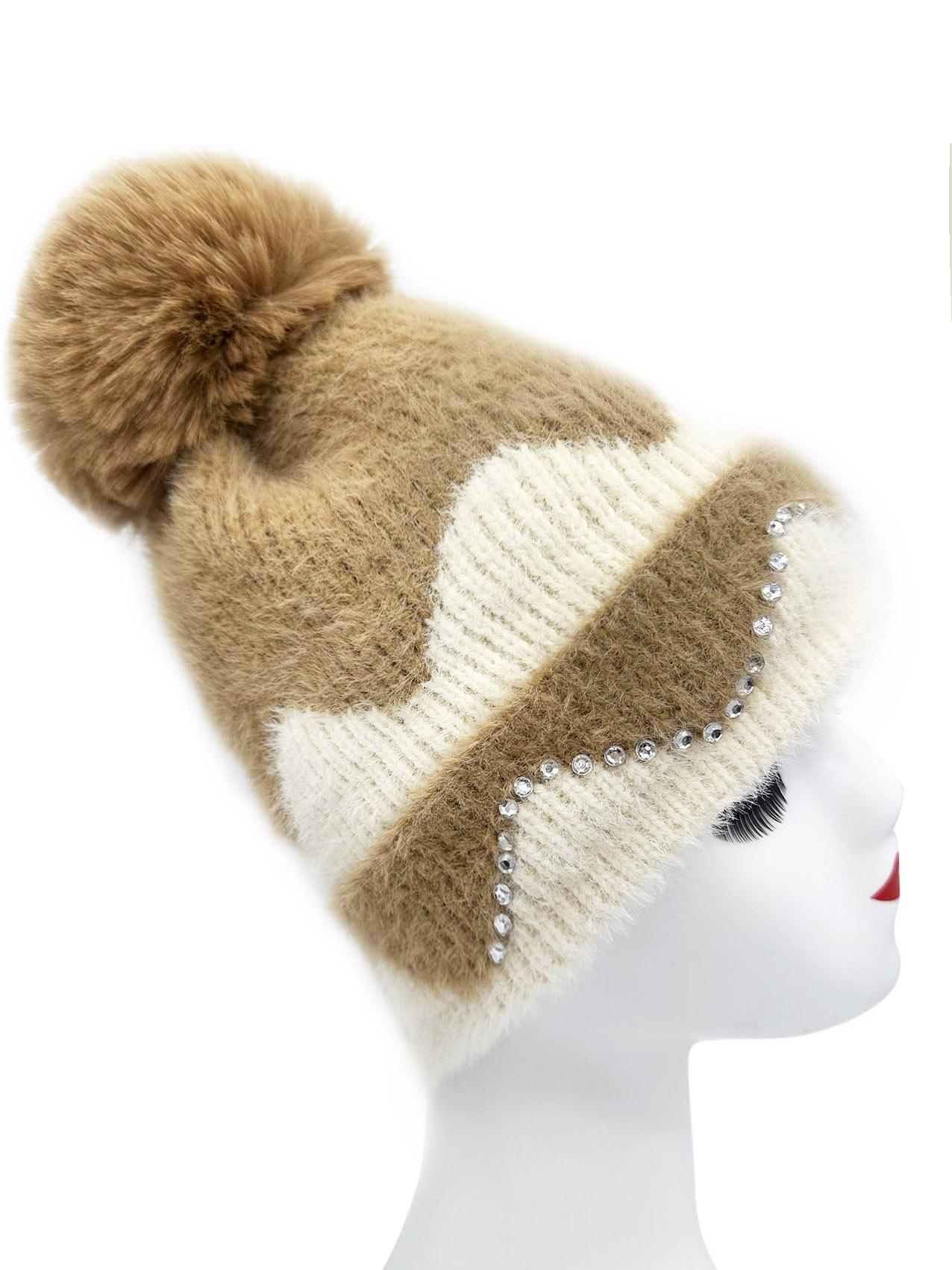 Double Layer Warm Plush Thickened Wool Ball Ear Protection Knitted Hat for Women Fashionable Jacquard Color Blocked Style