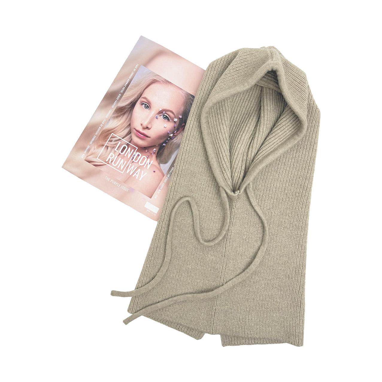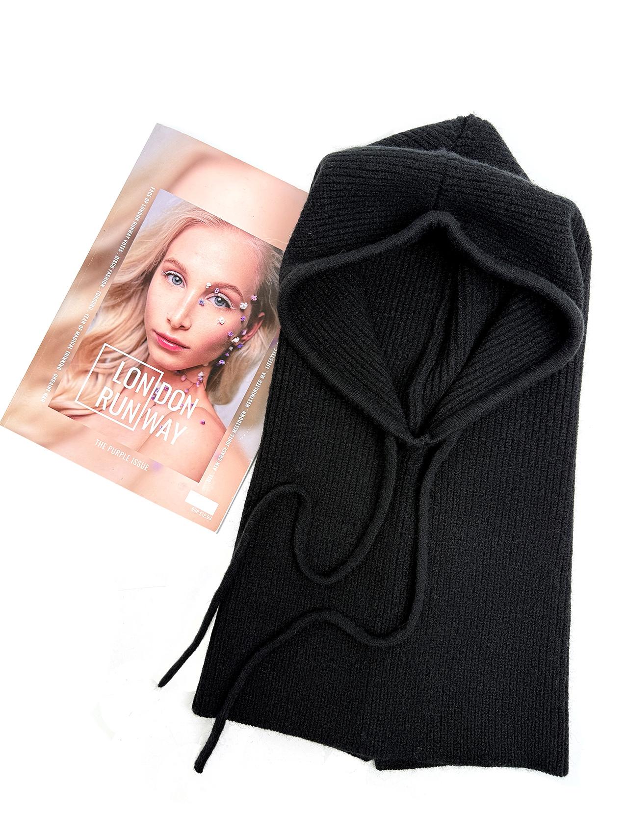 The image shows the hat scarf in black, paired with a magazine. Ideal for those looking for a versatile accessory.