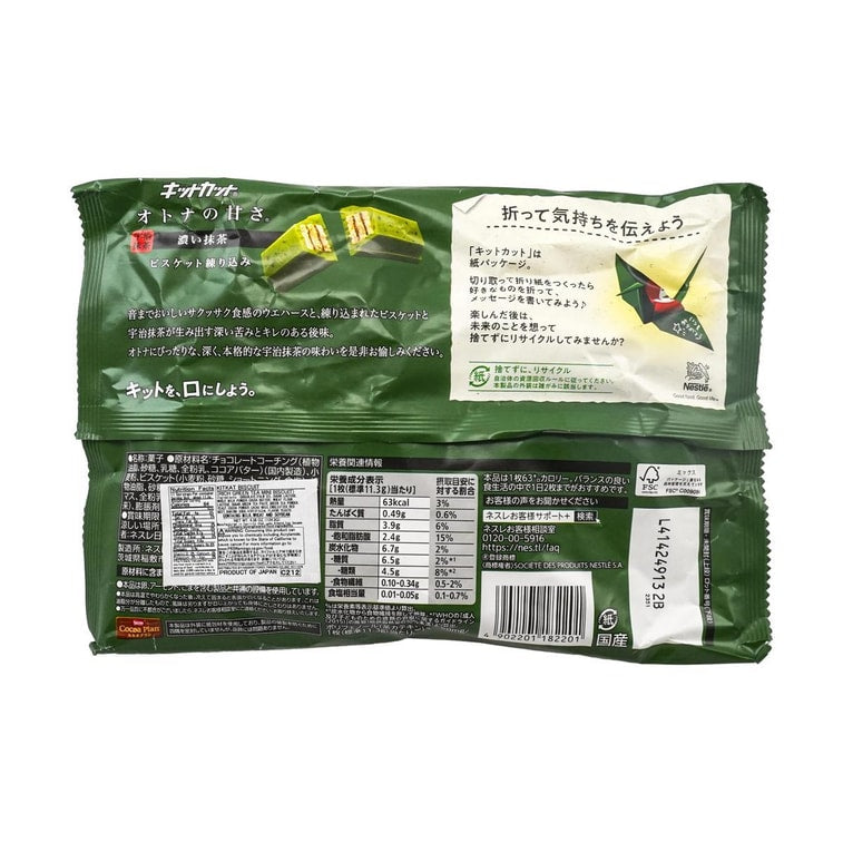 Chocolate Coating (Vegetable Oil, Sugar, Lactose (Milk), Whole Milk Powder, Cocoa Butter), Wheat Flour, Biscuits (Wheat Flour, Sugar, Shortening, Salt), Vegetable Oil, Sugar, Matcha, Lactose (Milk), Cocoa Powder, Green Tea, Cocoa Mass, Whole Milk Powder, Yeast, Cocoa Butter, Emulsifier (Soy Lecithins E322), Raising Agent (E500), Flavouring, Baking Soda, Yeast Food.
