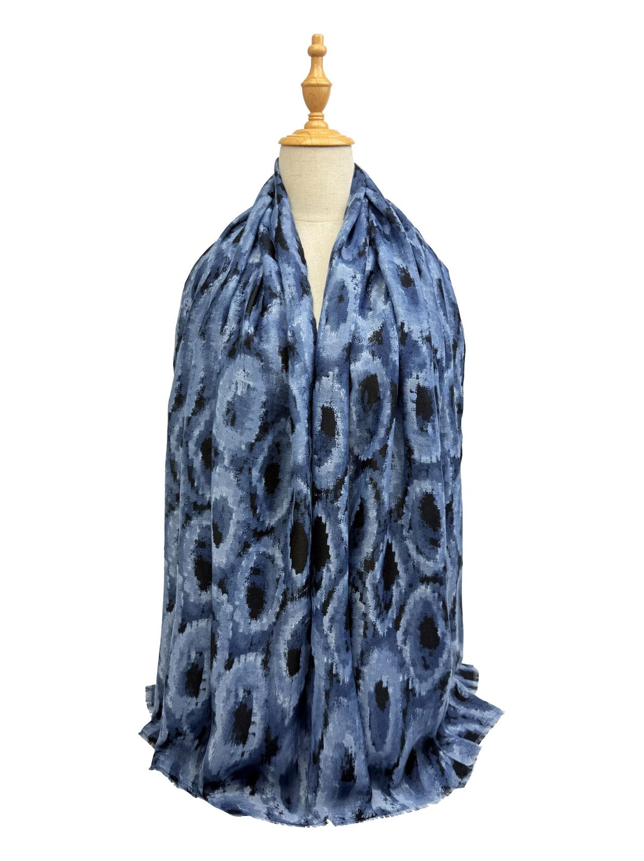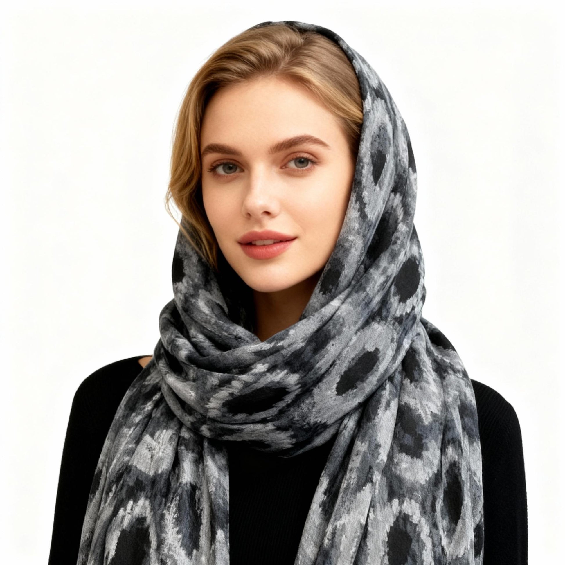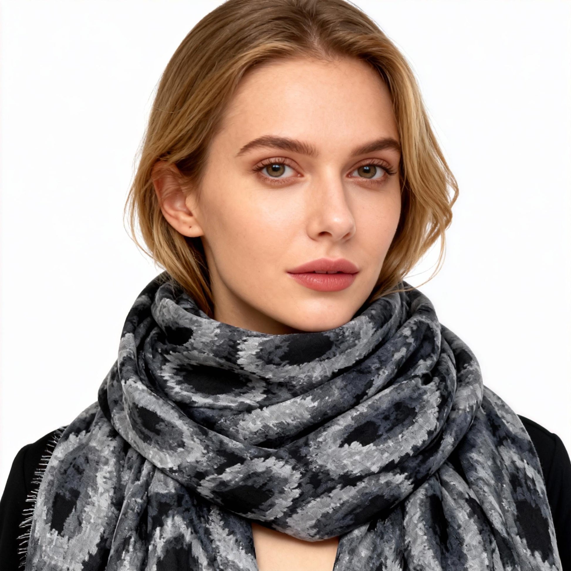 The image shows the scarf draped elegantly, highlighting its grey & black circle pattern. It's a versatile accessory for any winter outfit.