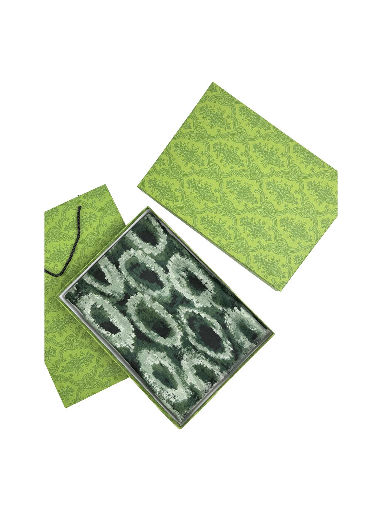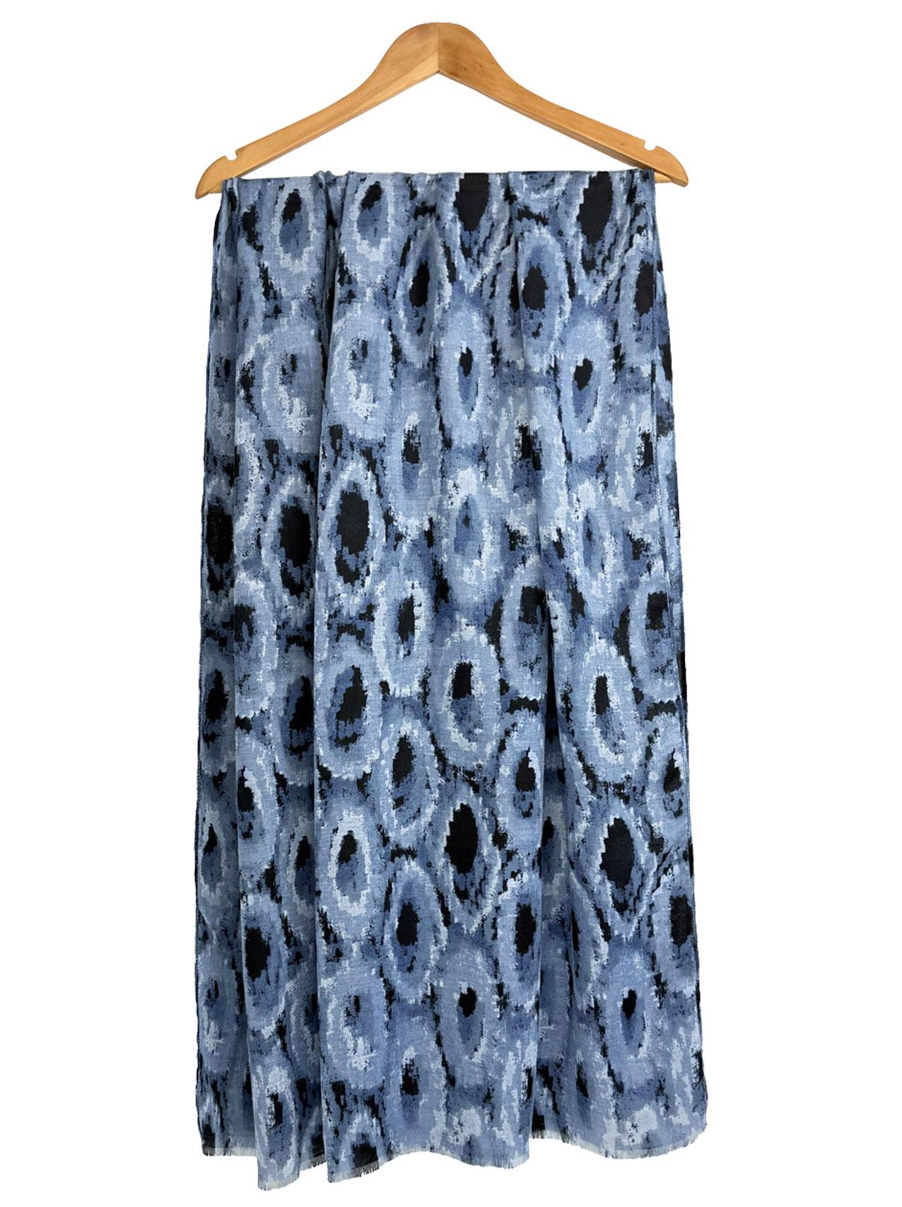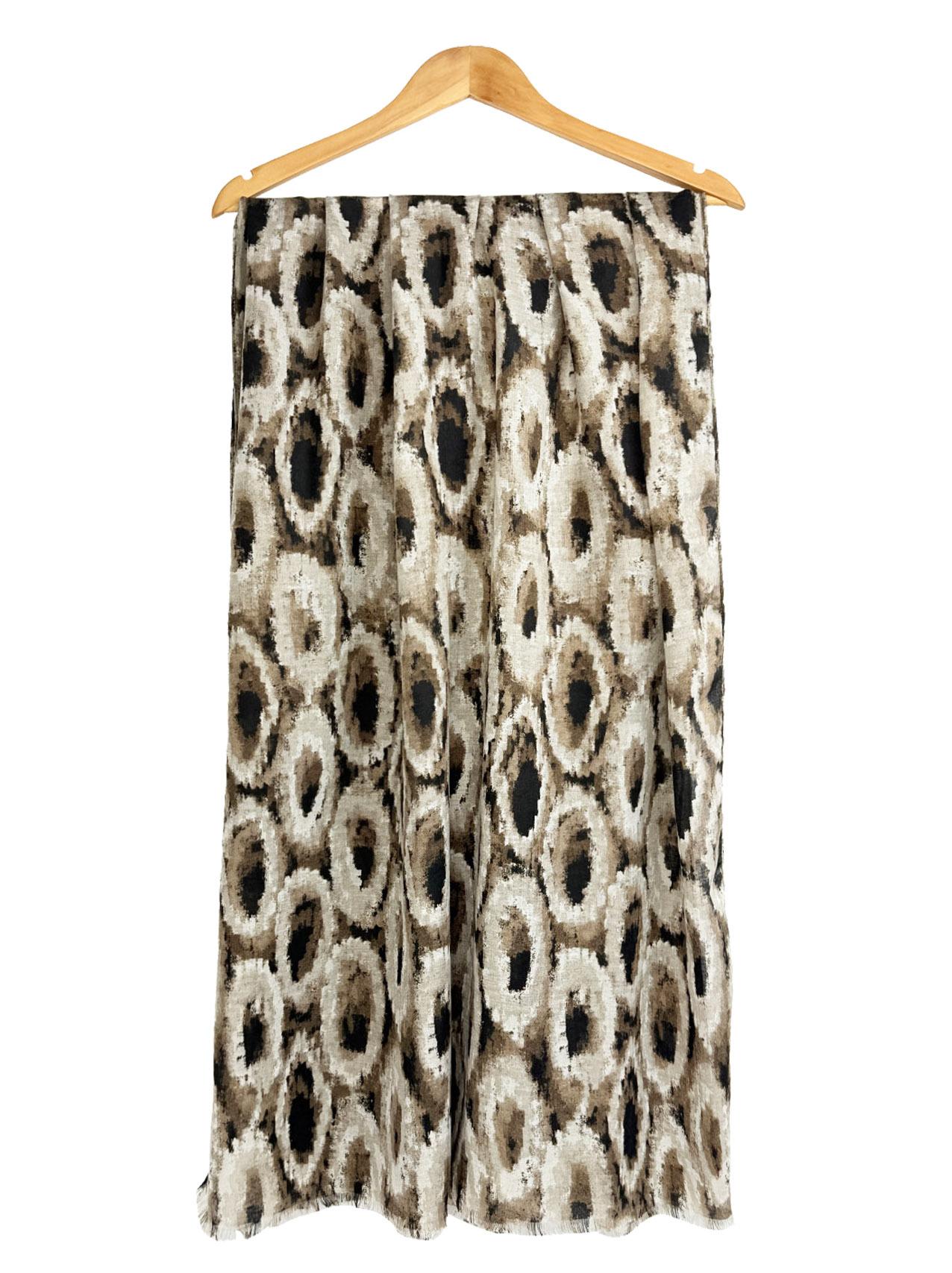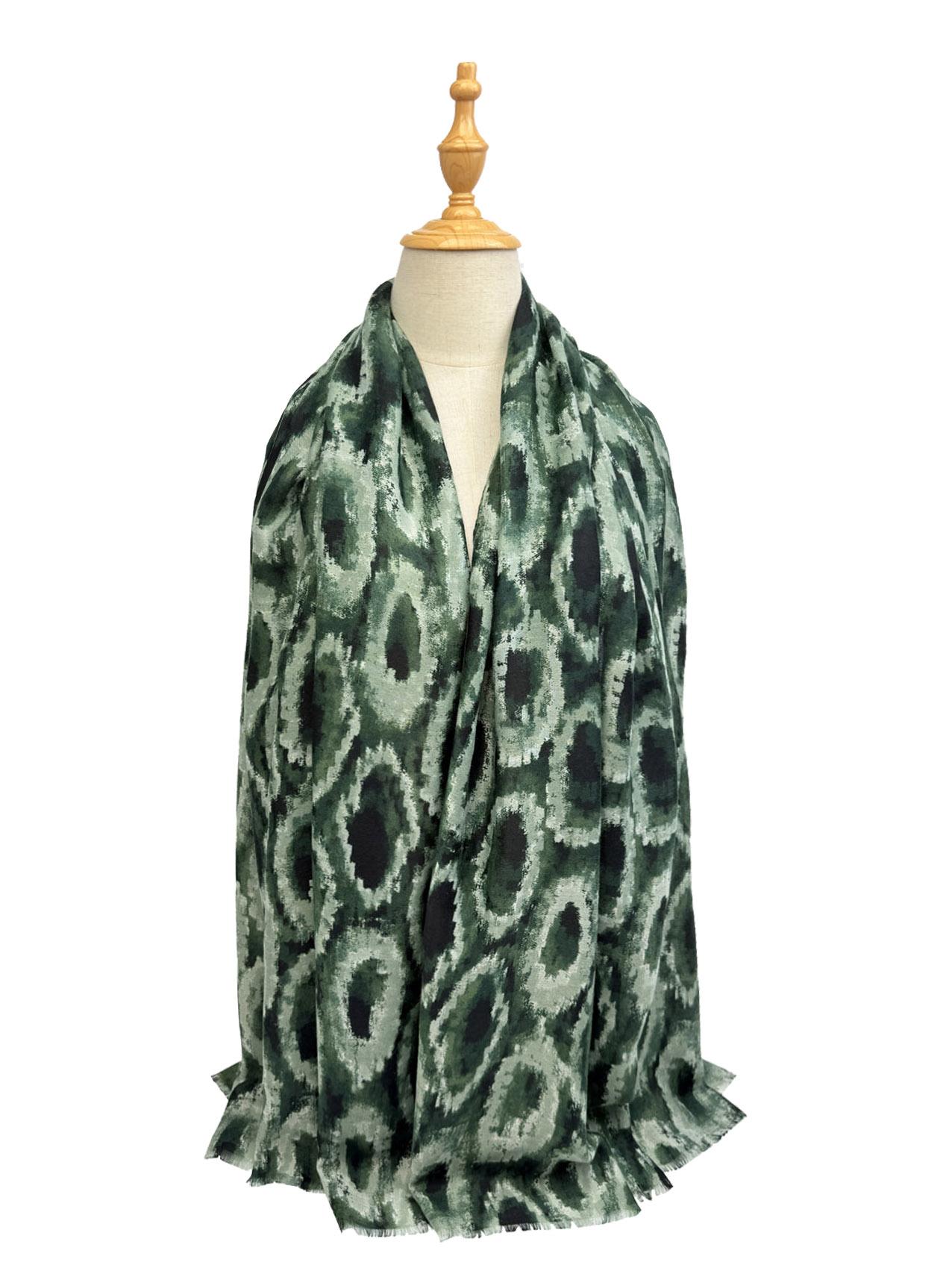 The image shows the scarf draped elegantly, highlighting its grey & black circle pattern. It's a versatile accessory for any winter outfit.