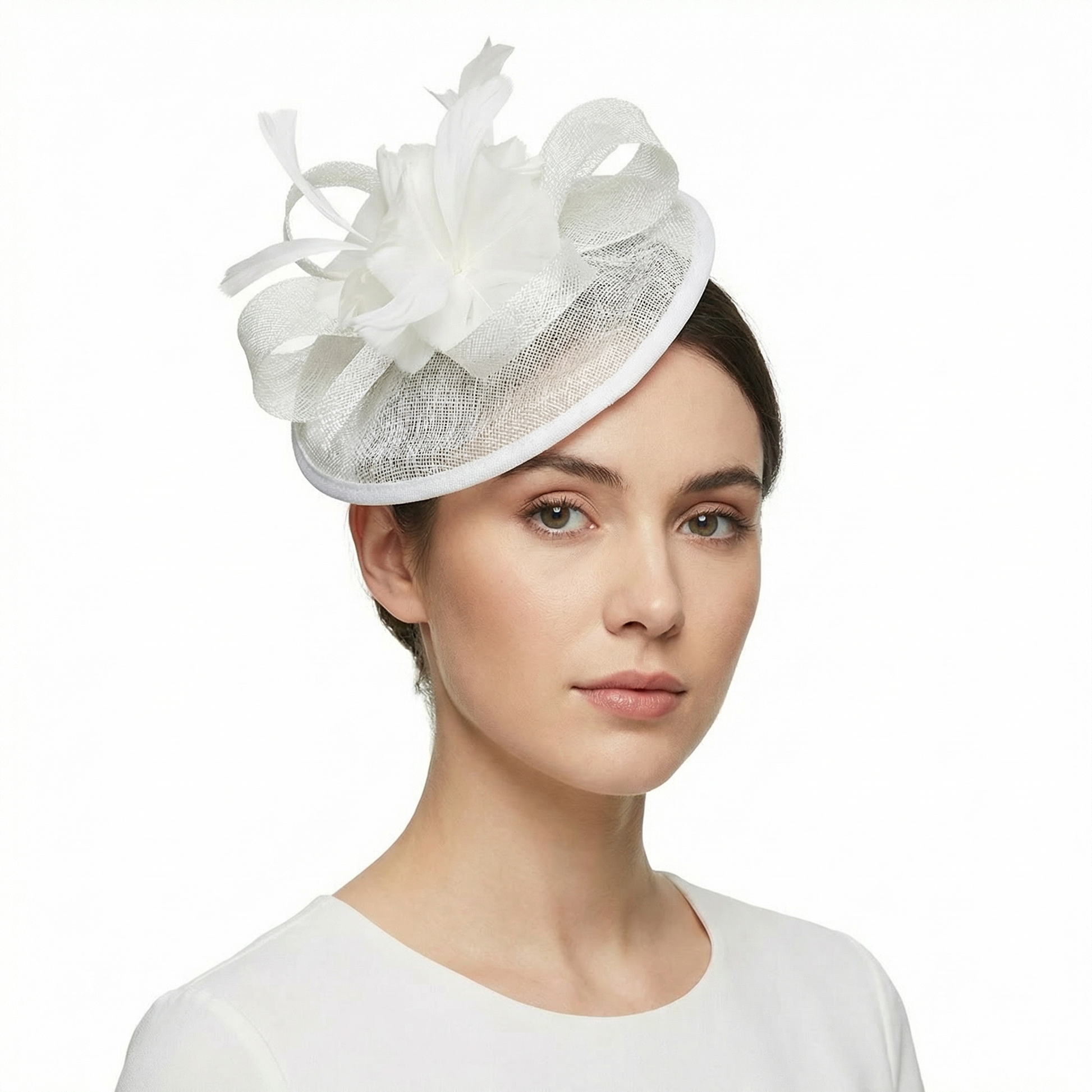 The Sinamay Hatinator features a spiral ribbon and a feather flower. This combination adds a touch of sophistication to any outfit. The spiral ribbon complements the feather flower, creating a harmonious look. Perfect for special occasions, this hatator is a stylish accessory.