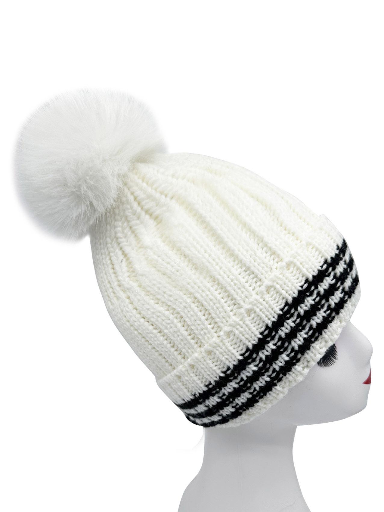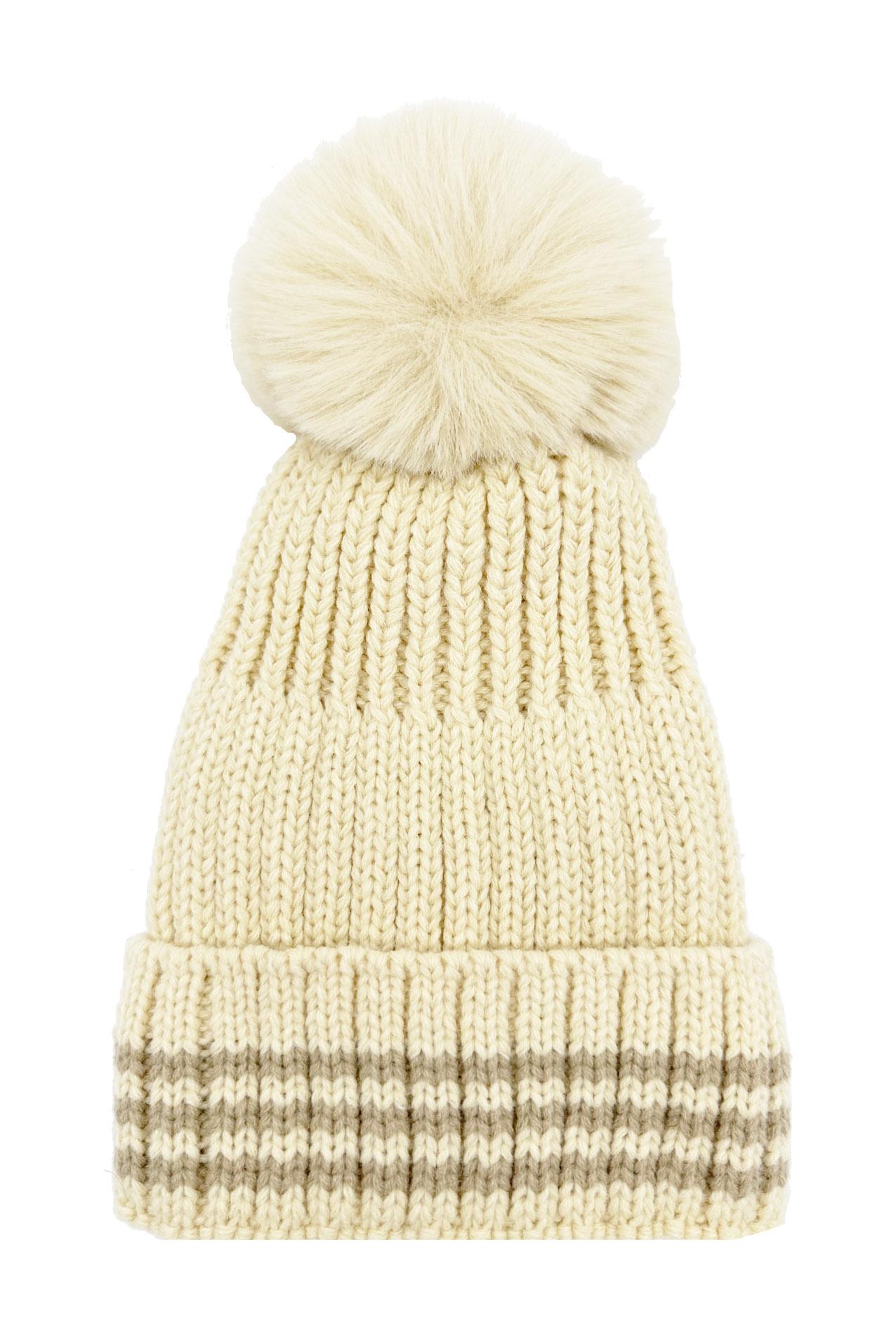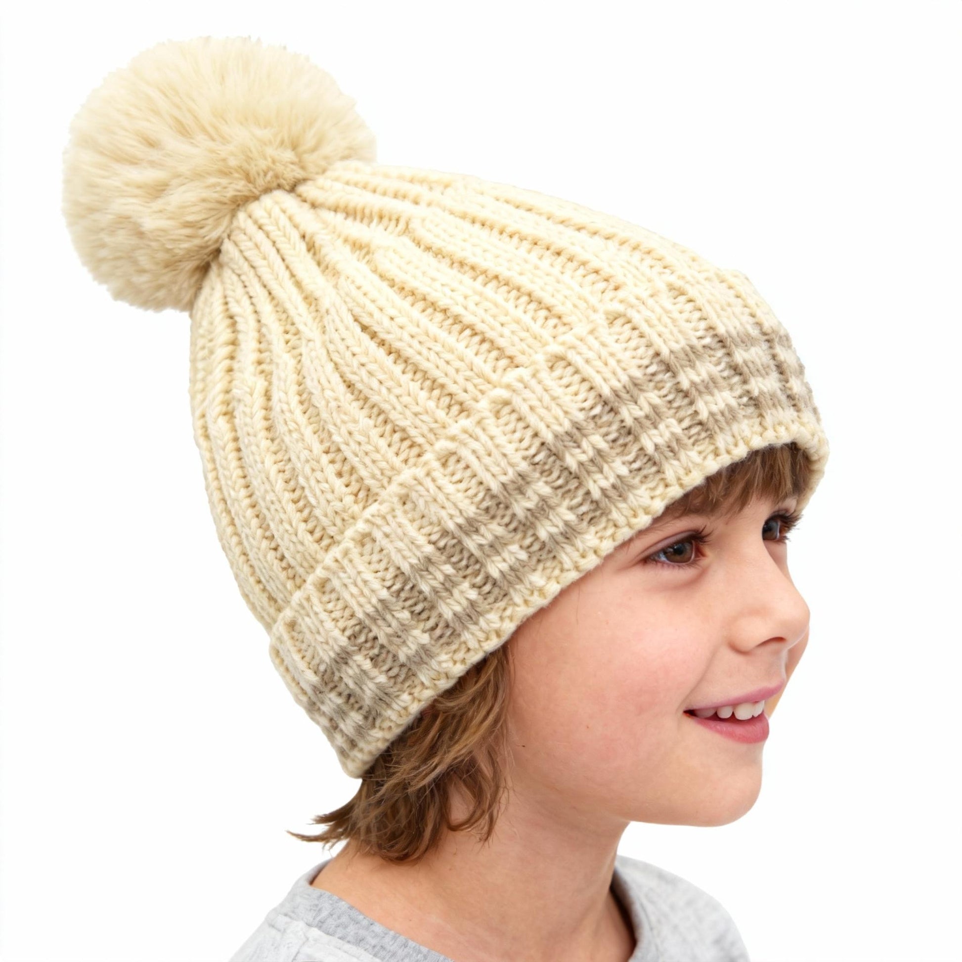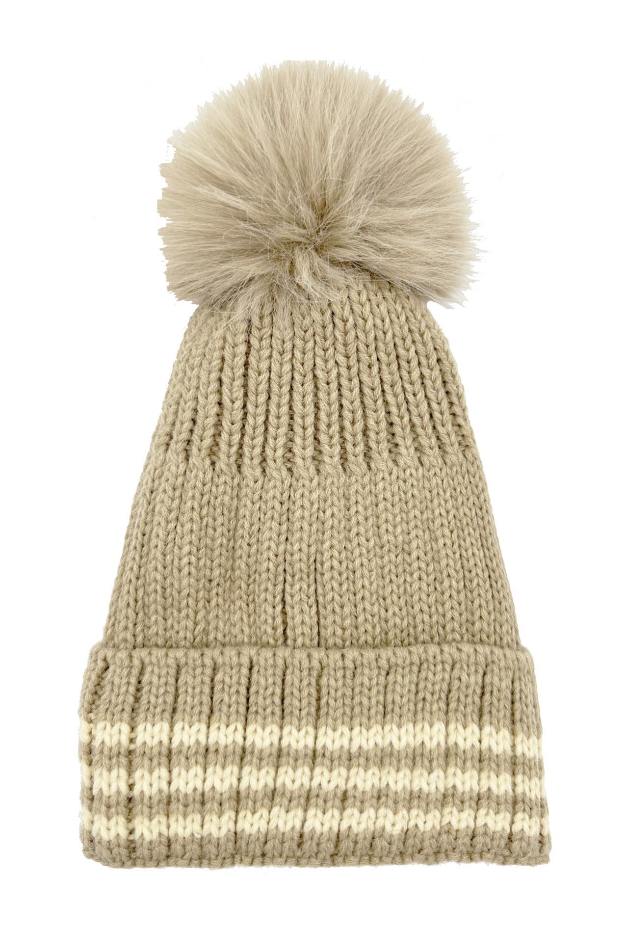 Autumn and Winter New Knitted Hat with Wool Ball and Thick Velvet for Warmth British English Style Beige Striped Design