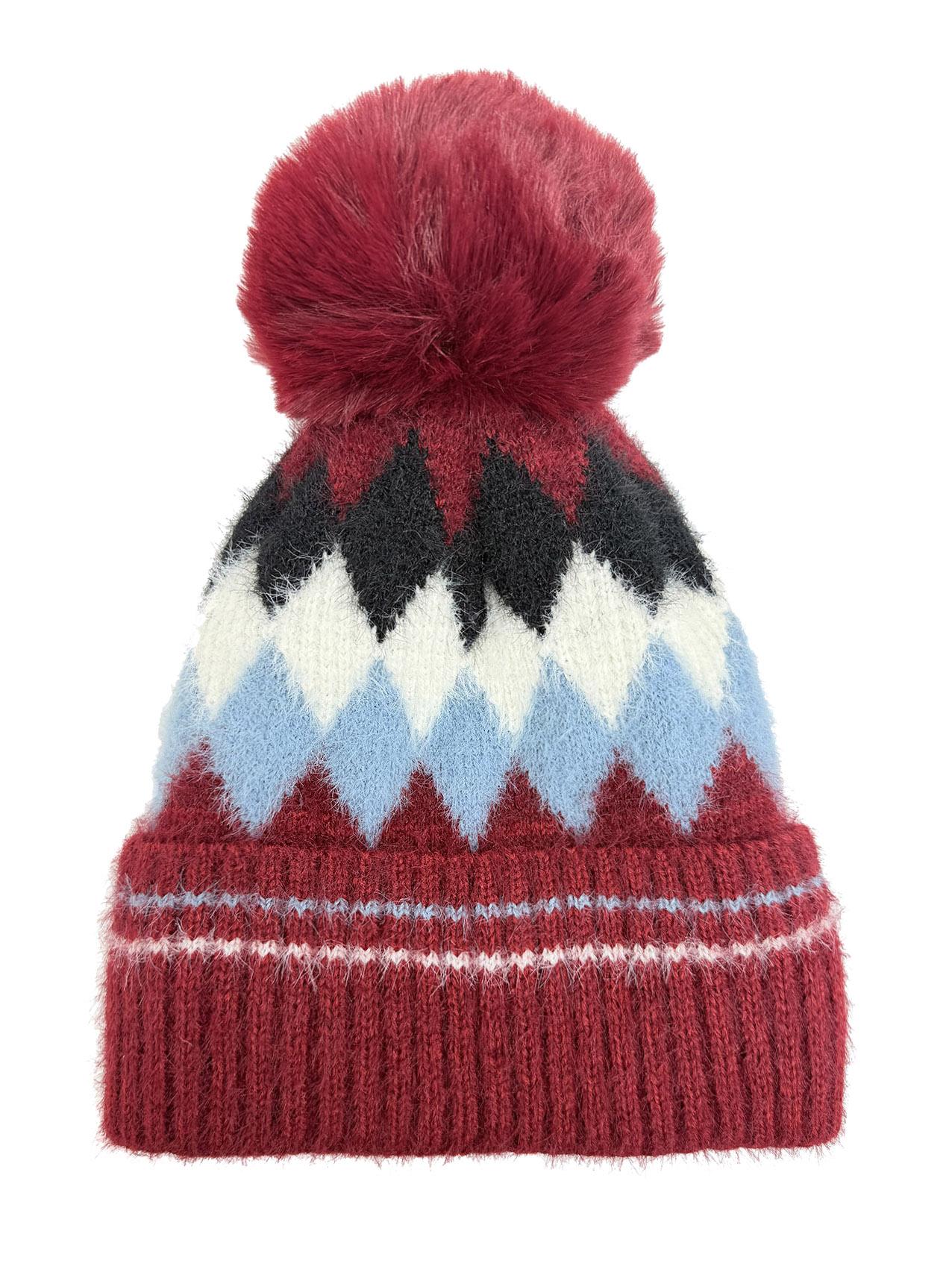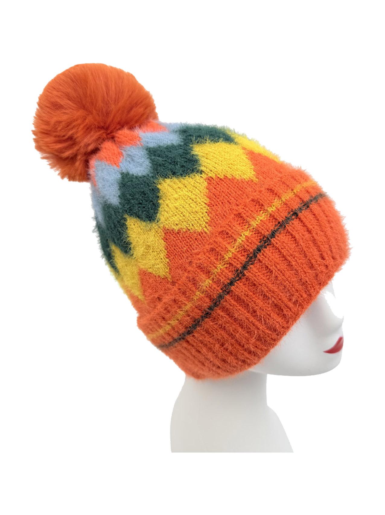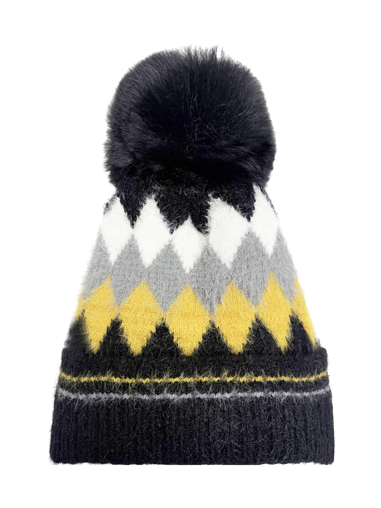 Winter Warm Hat Autumn Windproof Knitted Thick Woolen Hat Fashionable Trendy with Geometric Pattern and Pom-Pom